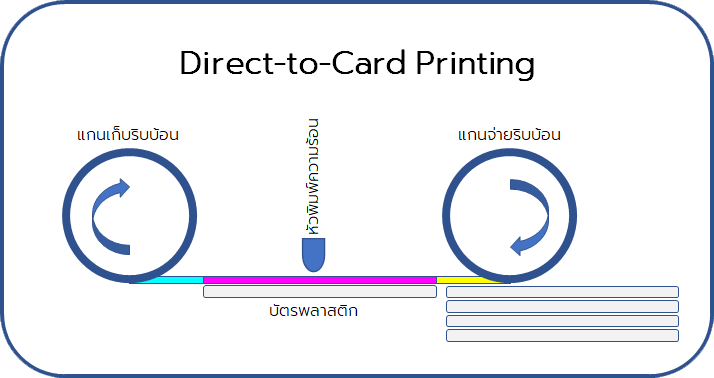 ![]() | ก่อนอื่น เรามาทำความเข้าใจเกี่ยวกับการพิมพ์ด้วยเทคโนโลยีหัวพิมพ์ความร้อนกันก่อน การพิมพ์ด้วยหัวพิมพ์ความร้อน ลักษณะของหัวพิมพ์จะเป็นแท่งกระเบื้องแนวยาว ที่ทำหน้าที่ทำความร้อนเป็นจุด ความละเอียดของเครื่องพิมพ์บัตรทั่วไปจะอยู่ที่ 300dpi และ 600dpi ความร้อนจะถูกคำนวนอย่างแม่นยำออกมาเป็นจุดตามแนวหัวพิมพ์ เพื่อระเหิดสีจากแผ่นริ้บบ้อนลงไปเนื้อบัตรพลาสติก |